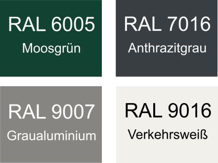 Farben: Anthrazitgrau (RAL 7016), Graualuminium (RAL 9007), Verkehrsweiß (RAL 9016), Moosgrün (RAL6005)