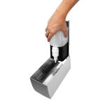 automatische Auslösung durch Infrarotsensor, zur Wandmontage, mit 500 ml Kunststoffbehälter frei befüllbar und entnehmbar, Kunststoffpumpe und Behälter auswechselbar, Aufputzmontage, batteriebetrieben (Batterien nicht im Lieferumfang enthalten), abschließbar, Füllstandsanzeige