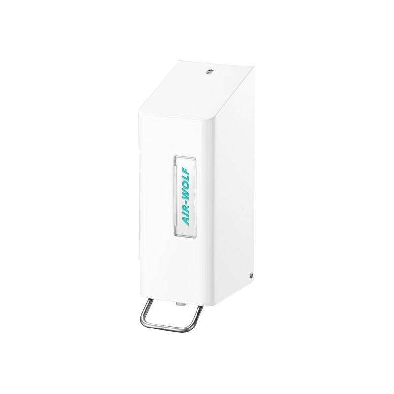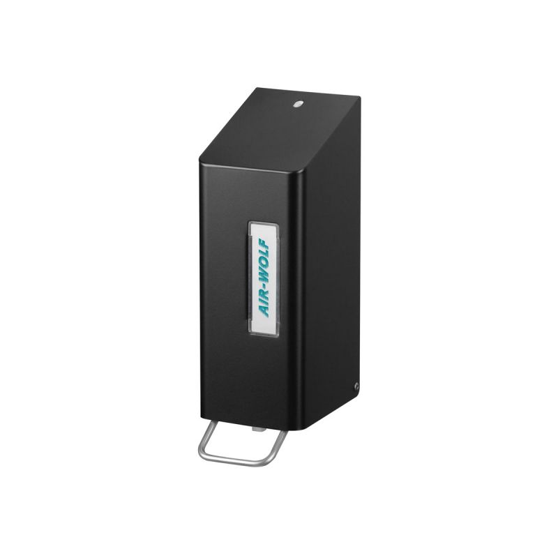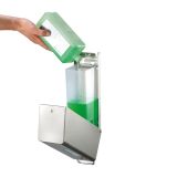 Spender aus Edelstahl, mit Edelstahl-Bedienhebel, in weiß, schwarz oder Edelstahl gebürstet, frei befüllbar mit Seife flüssig, Desinfektionsmittel, Waschlotion, mit herausnehmbarem Nachfüllbehälter, Bedienung durch Drücken Bedienhebel, Einheitsschloss, Füllstandsanzeige, abgeschrägte Oberseite